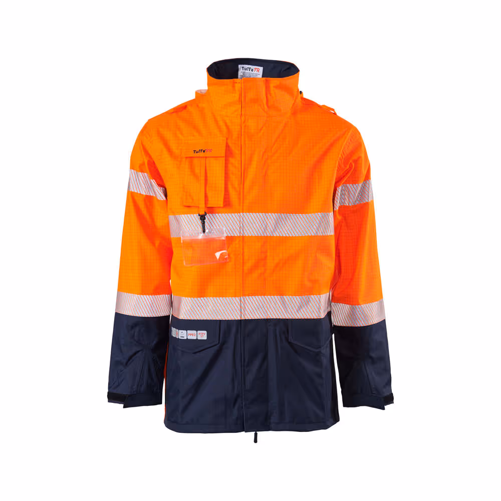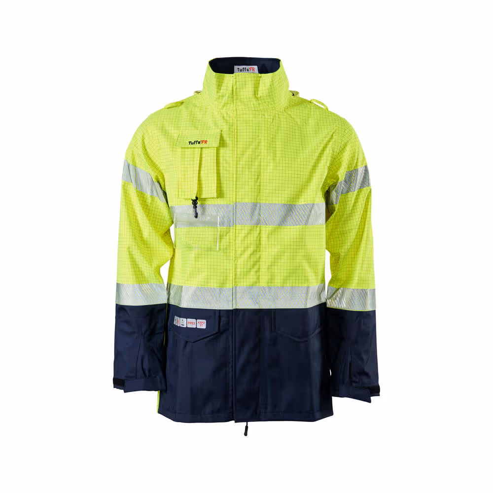 FR/ARC rated cold weather jacket featuring quilted fabric for warmth, cold weather specialized design, high collar for throat protection, chunky nylon zip covered with placket, left hand sleeve pen slots, twin shoulder radio loops, internal left hand chest pocket, and Velcro tab cuffs for adjustment.