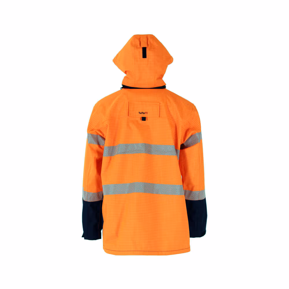 Inherently flame resistant wet weather jacket featuring fully sealed seams, stand up collar, storm flap with touch tape, twin shoulder radio loops, adjustable sleeve tabs, top right-hand chest radio pocket, twin lower waist pockets, segmented heat applied FR tape, back harness access point with secured flap, and multi-layer wet weather construction.