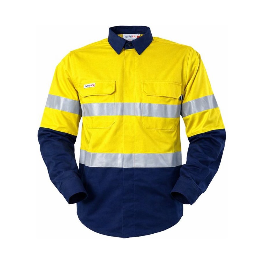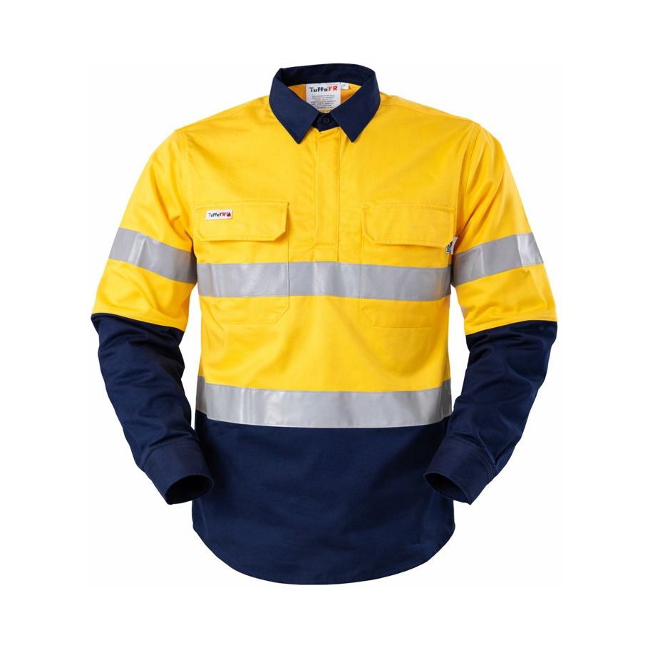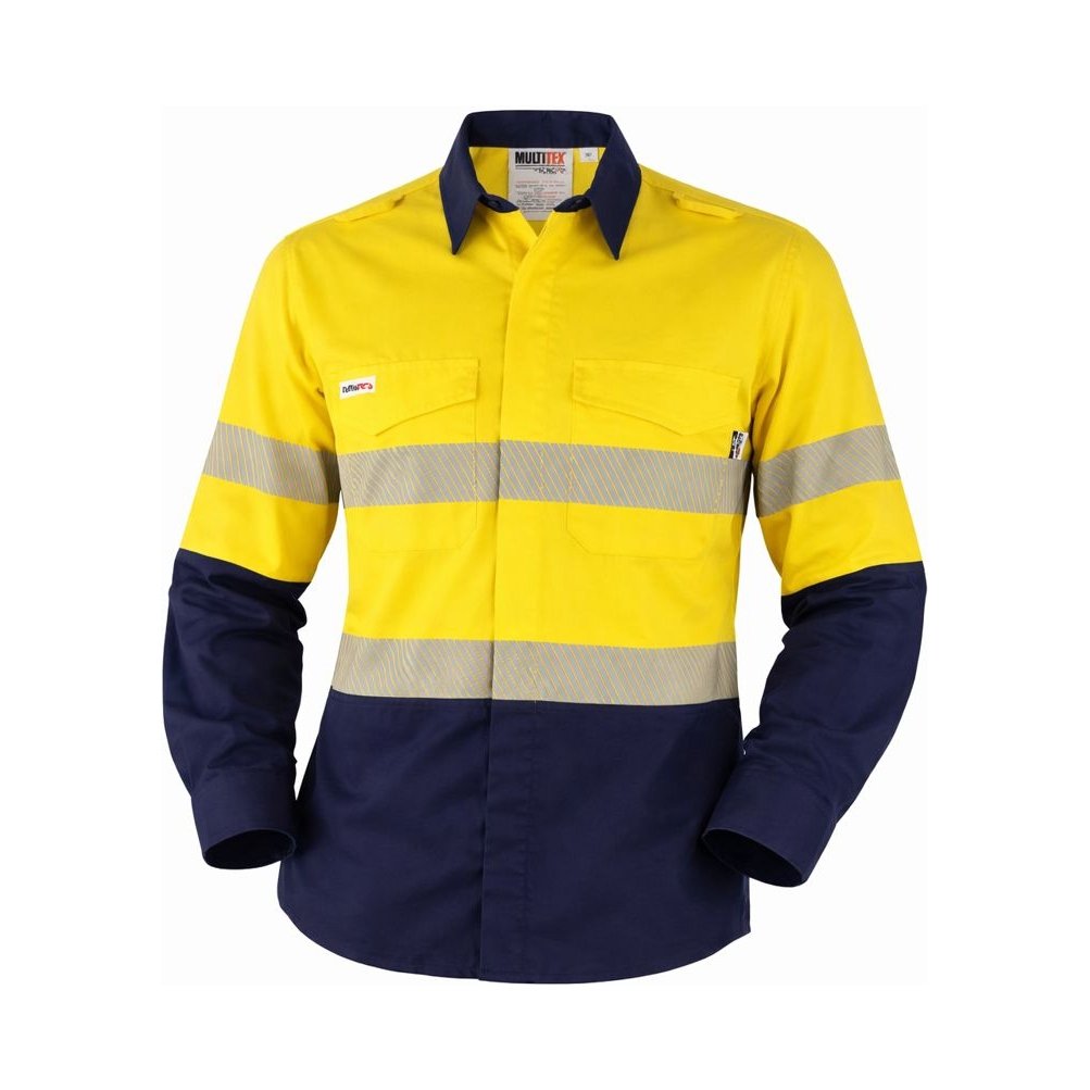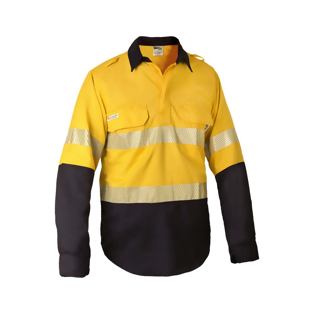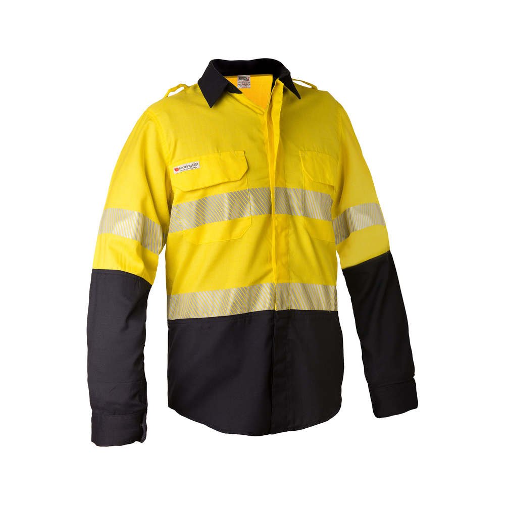 Inherently flame resistant shirt open front vented ppe2 featuring open front with buttons, twin chest pockets, radio loops, articulated elbows, and gusset cuff.