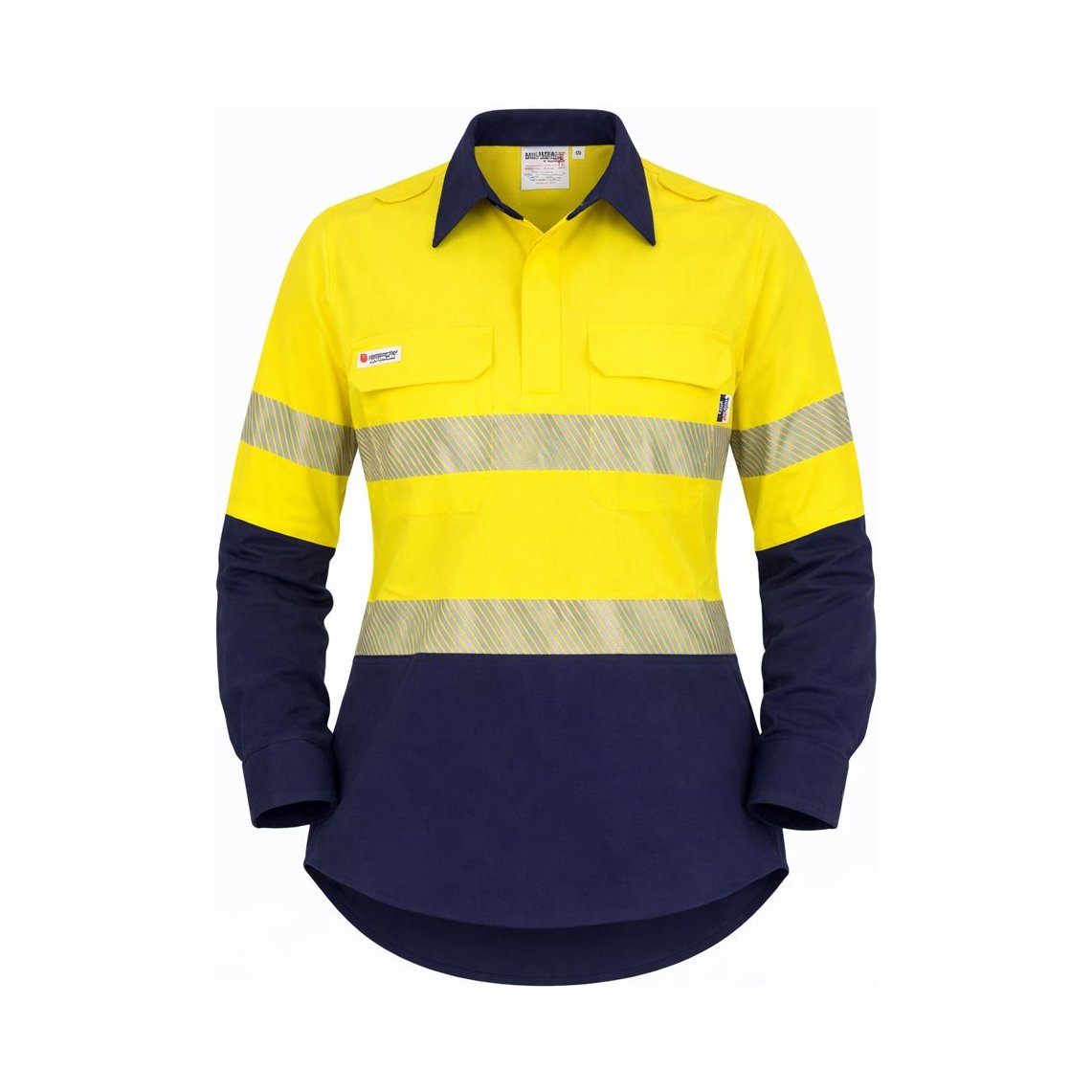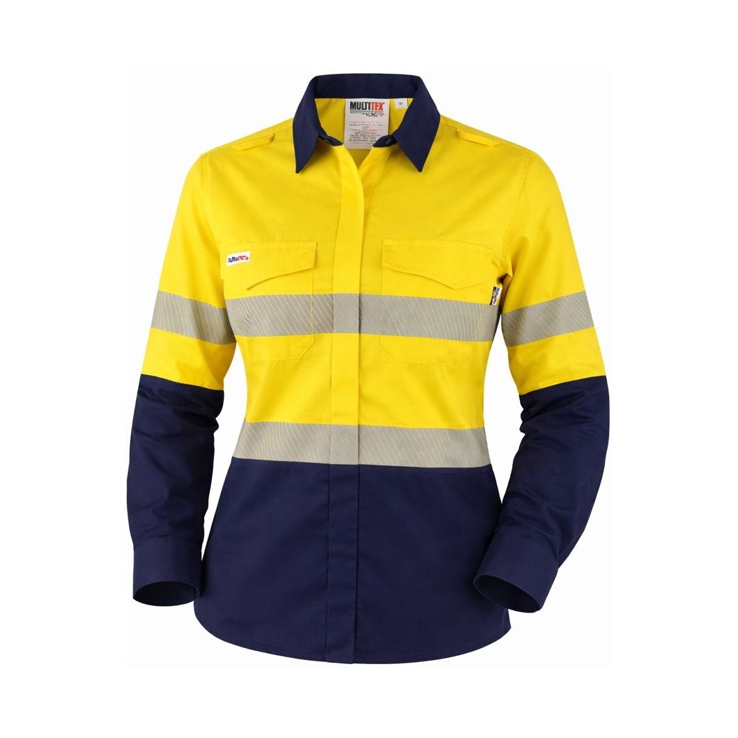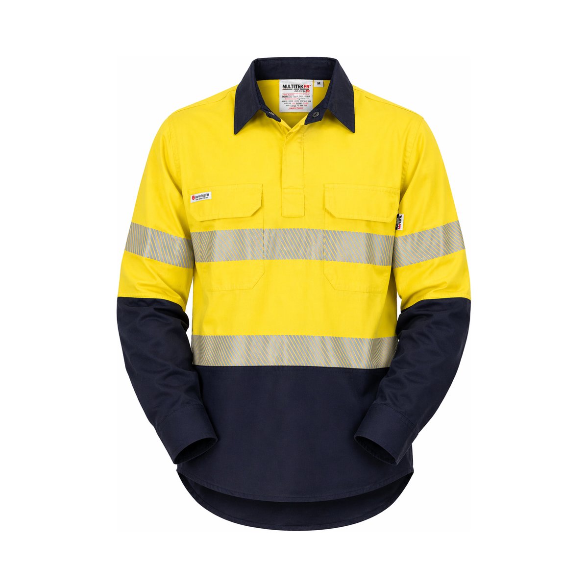 Inherently flame resistant shirt open front vented ppe2 featuring open front with buttons, twin chest pockets, radio loops, articulated elbows, and gusset cuff.