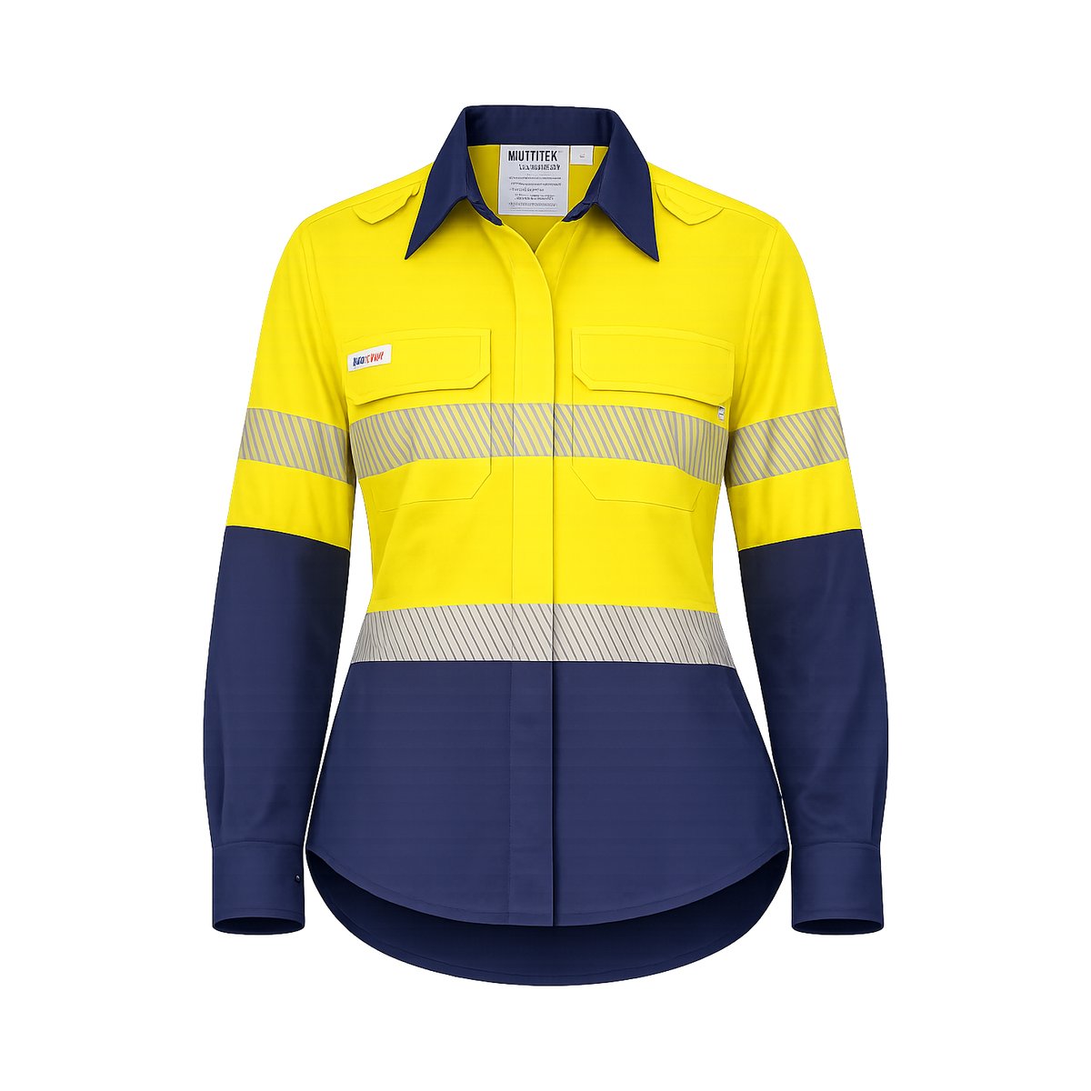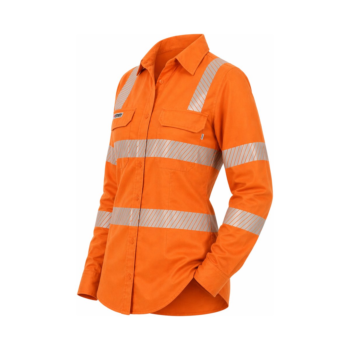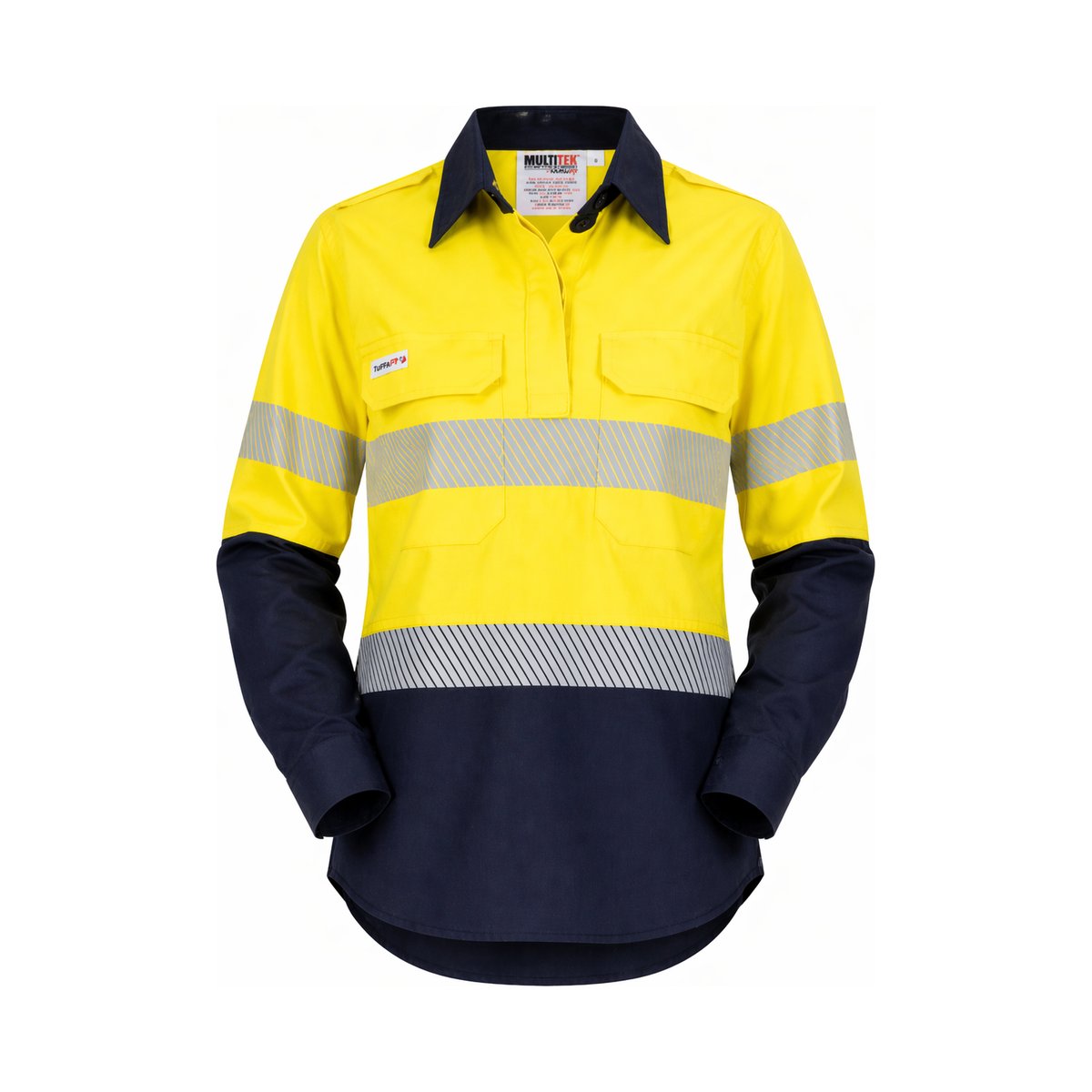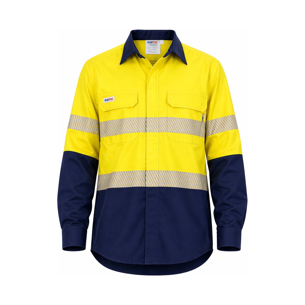 Inherently flame resistant shirt open front vented ppe2 featuring open front with buttons, twin chest pockets, radio loops, articulated elbows, and gusset cuff.