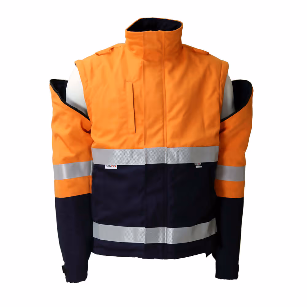 Inherently flame resistant 2-in-1 jacket featuring removable zip-off sleeves, 2-in-1 convertible design, quilted FR lining for warmth, internal left hand pocket, external chest right hand pocket, lower hip pockets, nylon zip front, left hand sleeve pen pocket, radio loops, Velcro tab sleeves, and extra long back length.