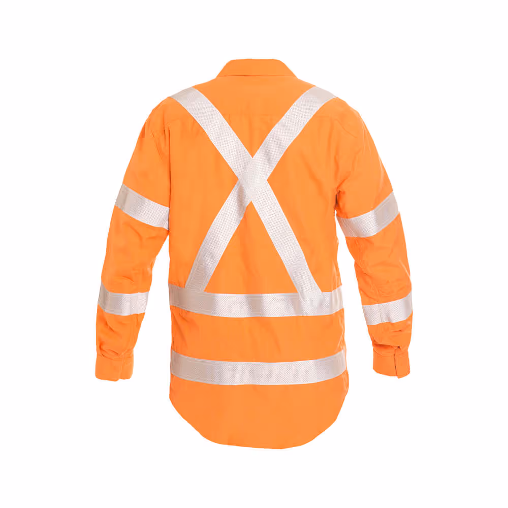 Lightweight extremely breathable rail industry compliant inherently flame resistant shirt featuring twin chest pockets with concealed nylon press studs and pen slots, open front concealed buttons, pleated back for extra movement, articulated elbows, radio loops, gusset cuff for wrist protection, and heat applied FR tape technology.