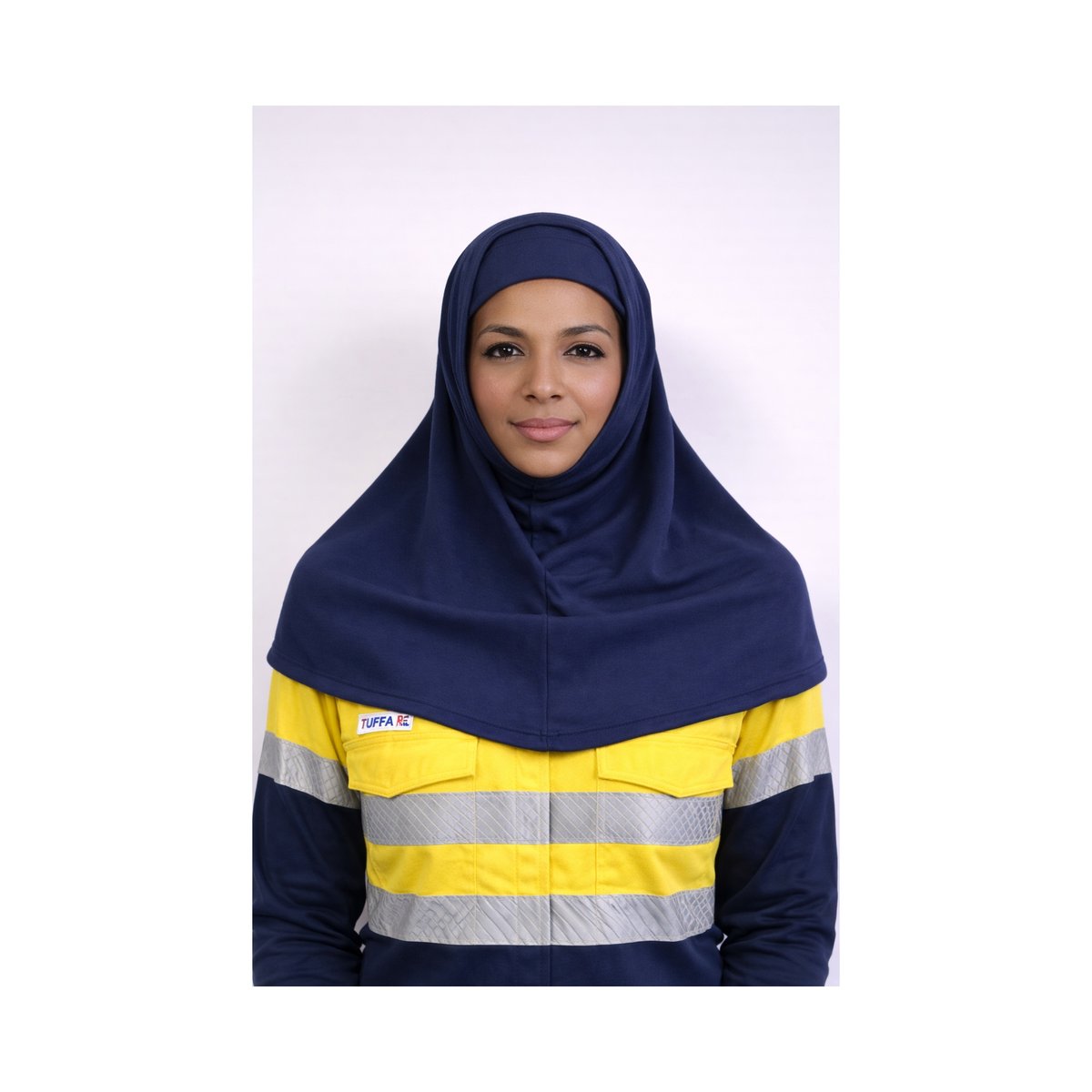 FR/ARC rated inherently flame-resistant knit hijab featuring stretch knit for comfort and flexibility. Available in Orange, Navy, and Yellow.