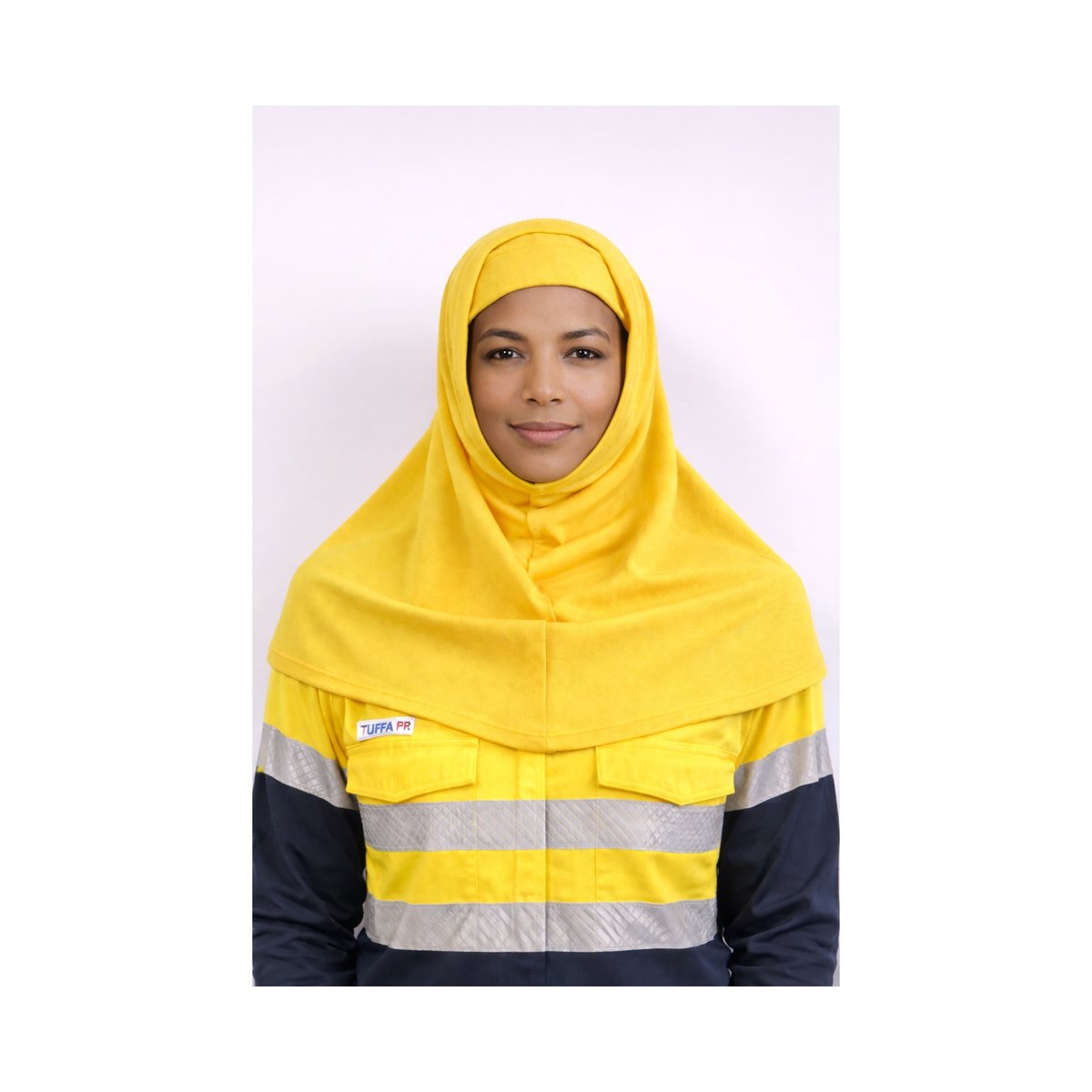 FR/ARC rated inherently flame-resistant knit hijab featuring stretch knit for comfort and flexibility. Available in Orange, Navy, and Yellow.
